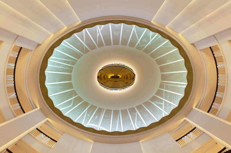 Details within the perforated white frieze are revealed and hidden again depending on the viewing angle and the time of day while 4 discreet visual cues referencing the main cardinal points helps the visitor relates to its position in space and time.